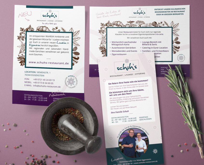 Ein neuer Markenauftritt für das „Schuh’s Hotel & Restaurnat“ durfte ich zusammen mit den Eigentümern Sarah und Alexander Schuh verwirklichen. Denn ihre neue Location in Eggenstein ist bereit zur Neueröffnung. Hier kocht Alex, bekannt für seine excellenten Kochkünste, auch weiterhin für seine Gäste, jedoch können sie dann im gemütlichen Lounge Bereich noch einen Cocktail trinken oder sich im großzügigen Außenbereich verwöhnen lassen. Da auch das Catering teil des Geschäftsmodelles ist, wurde auch dies im Logo Namen berücksichtigt.